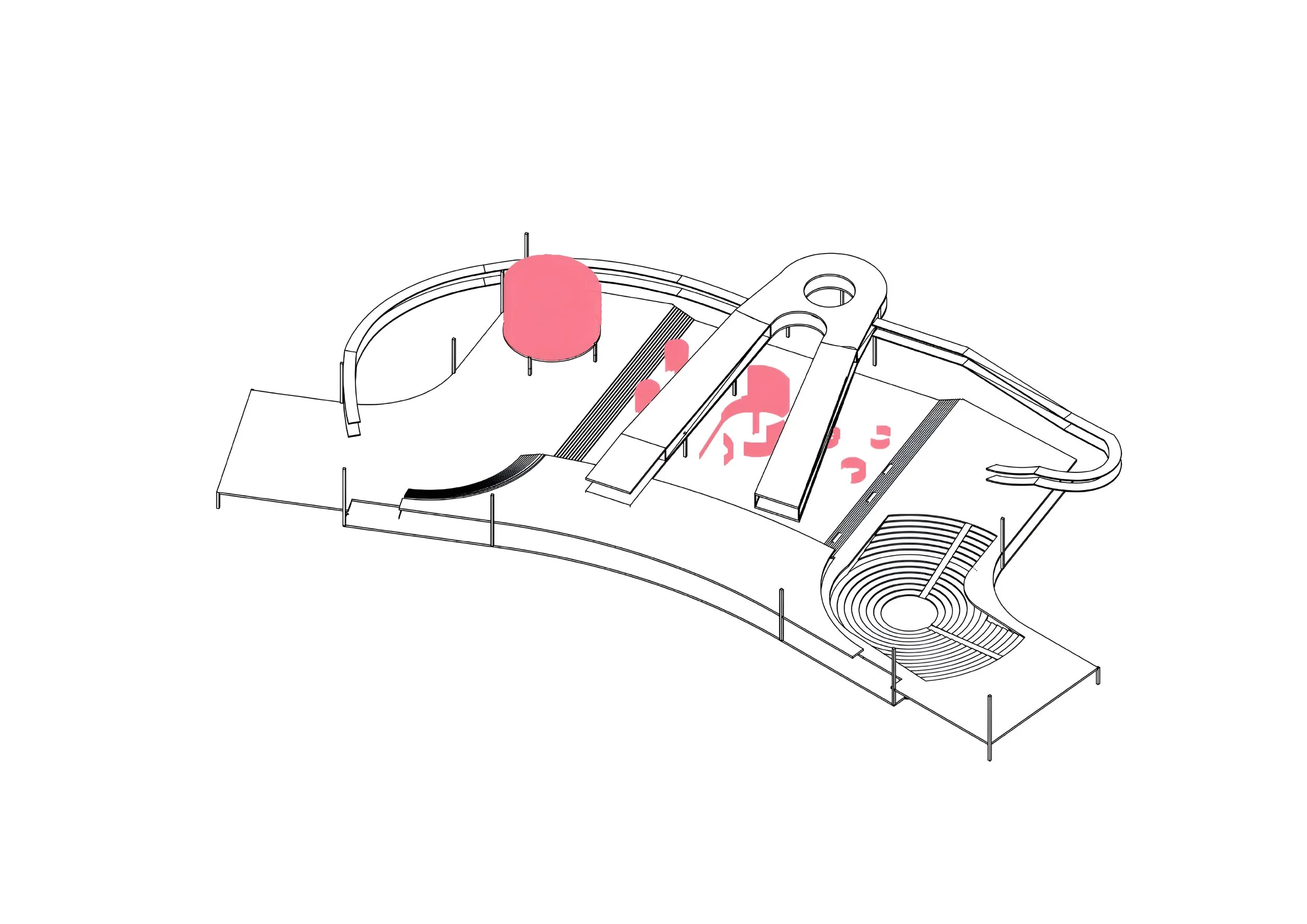 The amphitheater for 1000 people is designed for mass events and is an open space that flows on the second floor into a recreation area and an entrance area on the first