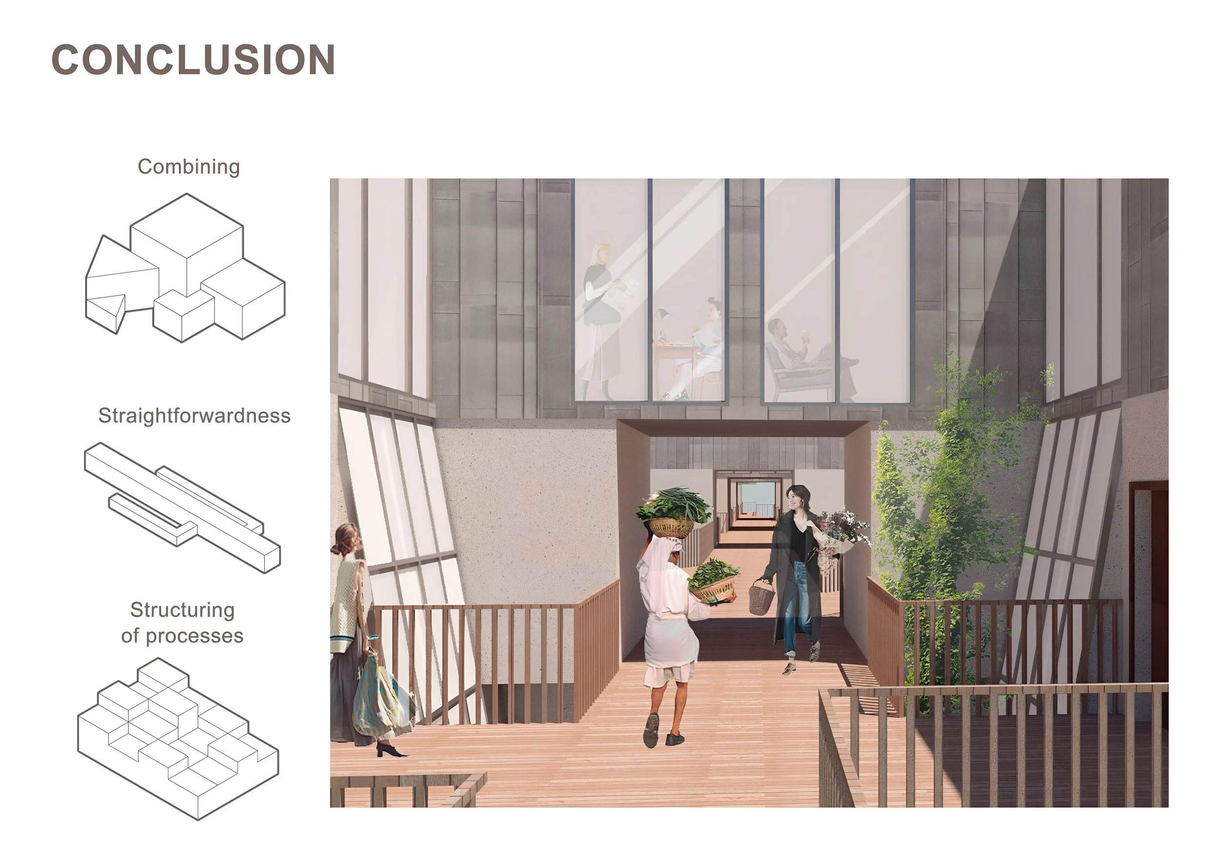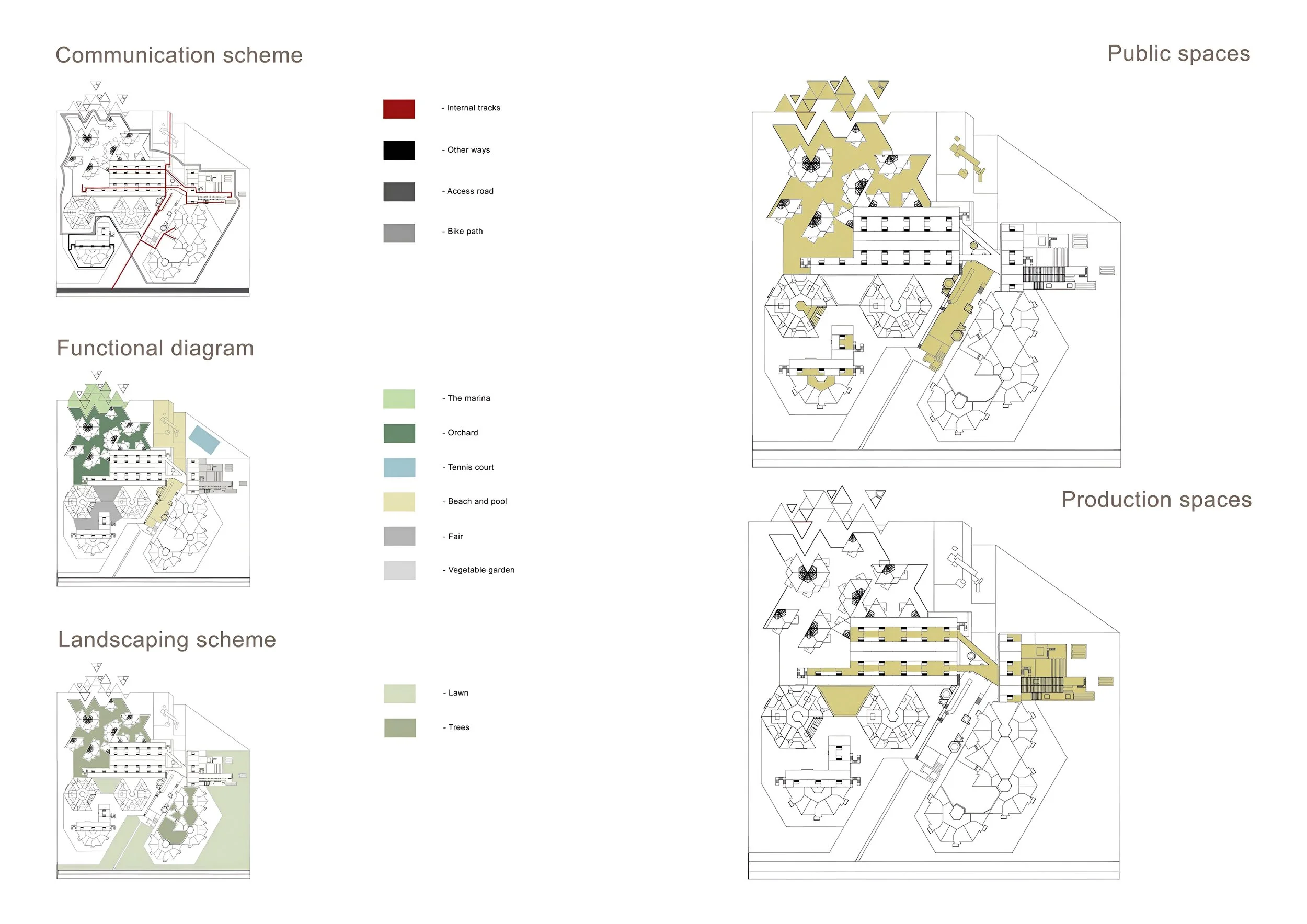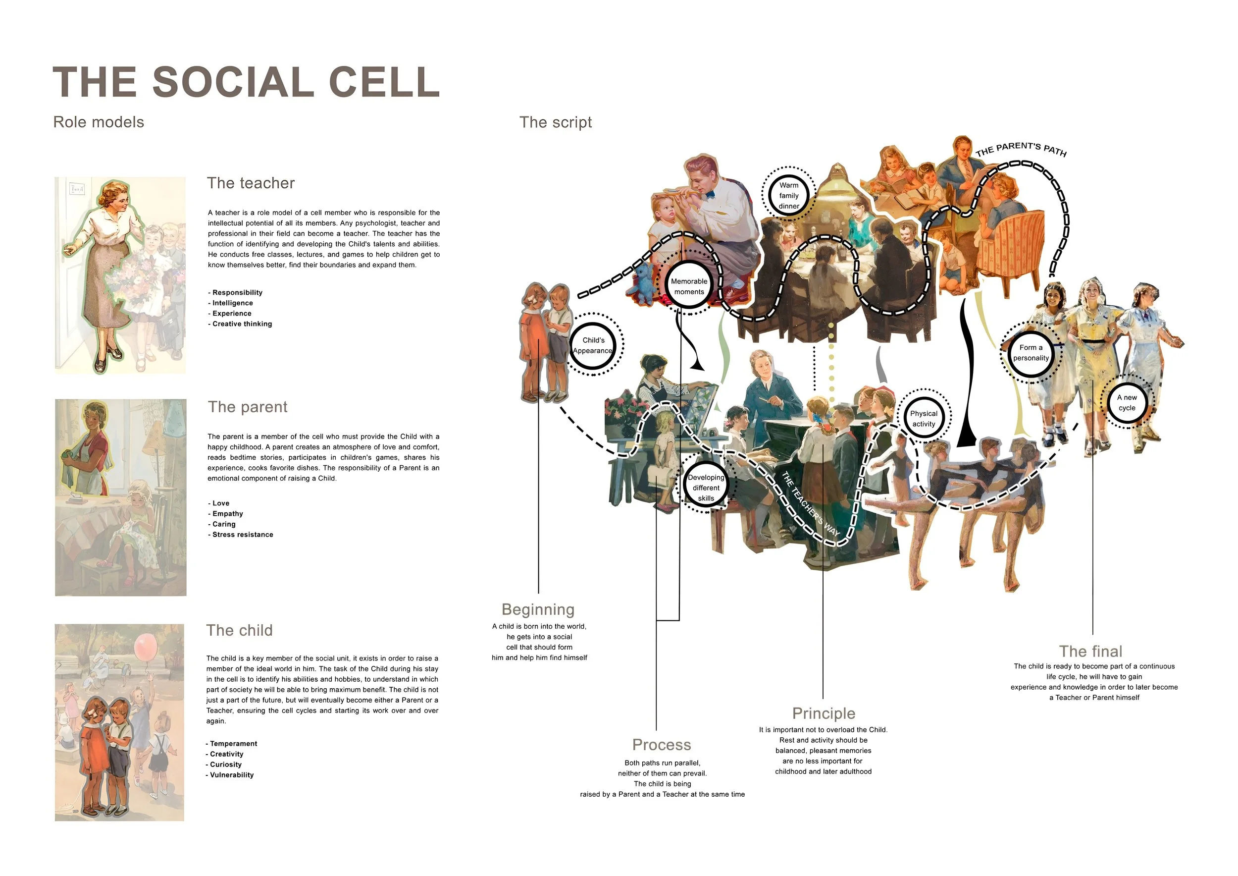 In the project, the author discusses what the ideal society of the future should be like and, equally important, how to grow a full-fledged member of this society. A project of a blocked complex is proposed, in which cells are located for the joint life of individuals with the role models Parent, Teacher, Child. The author considers this trio to be ideal, since the Parent is engaged in the emotional upbringing of the Child, and is also responsible for the development of imagination and creativity, and the Teacher is engaged in structuring the Child's skills that he can apply in later life. This is how we approach the main idea of the project: the continuity of the life cycle. Growing up, the Child himself will become either a Parent or a Teacher in order to educate new comprehensively developed members of society.