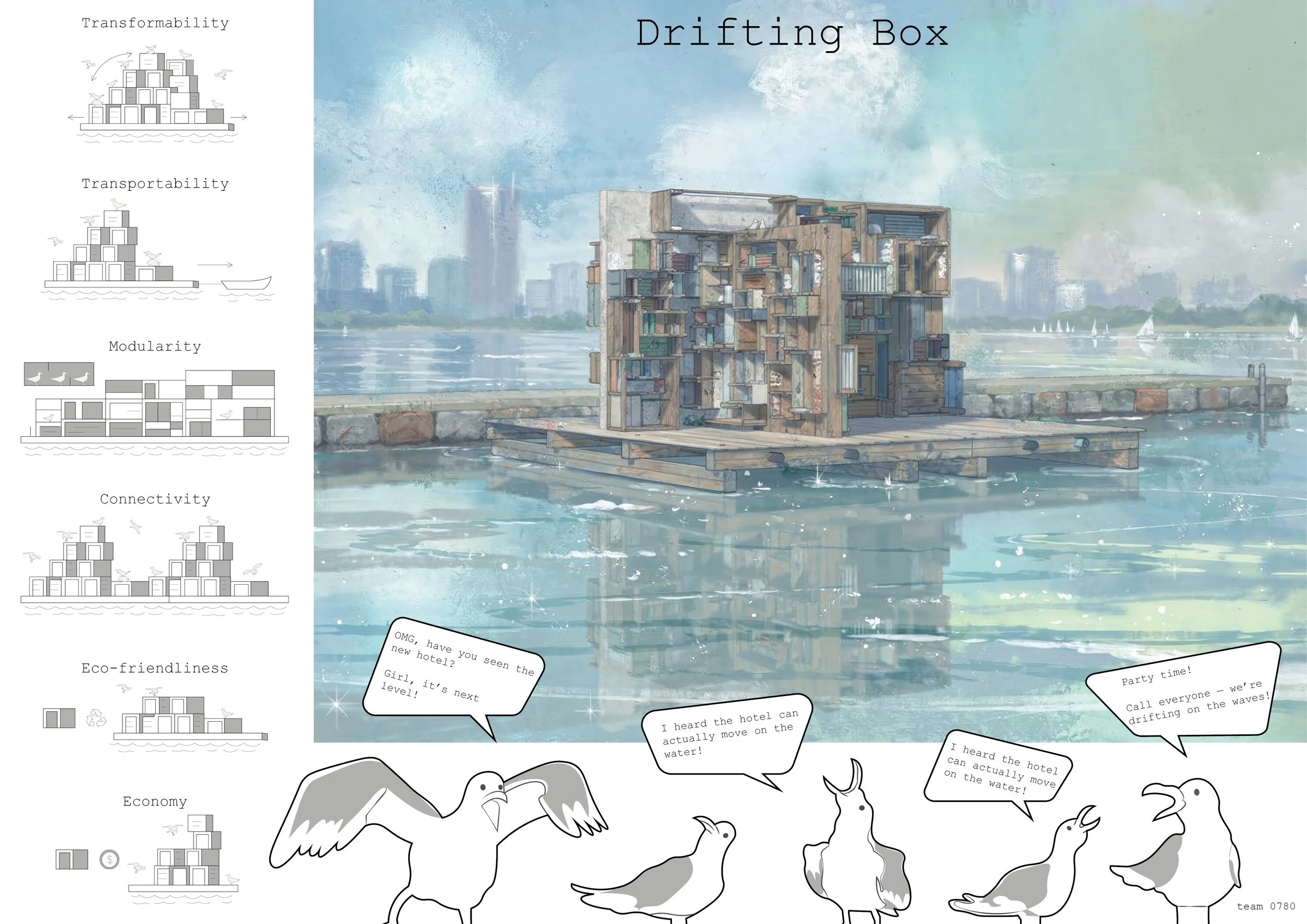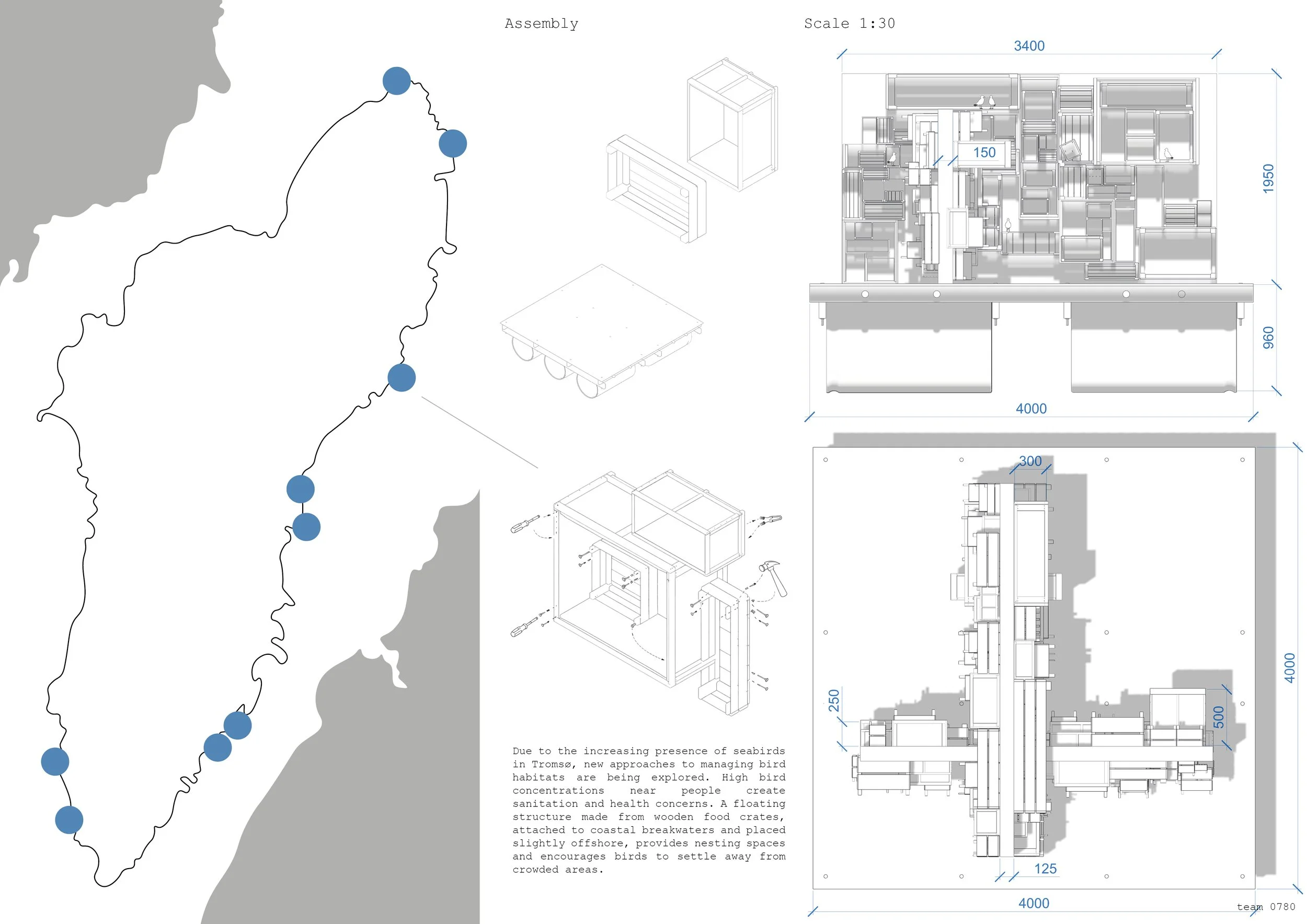 Due to the increasing presence of seabirds in Tromsø, new approaches to managing bird habitats are being explored. High bird concentrations near people create sanitation and health concerns. A floating structure made from wooden food crates, attached to coastal breakwaters and placed slightly offshore, provides nesting spaces and encourages birds to settle away from crowded areas.