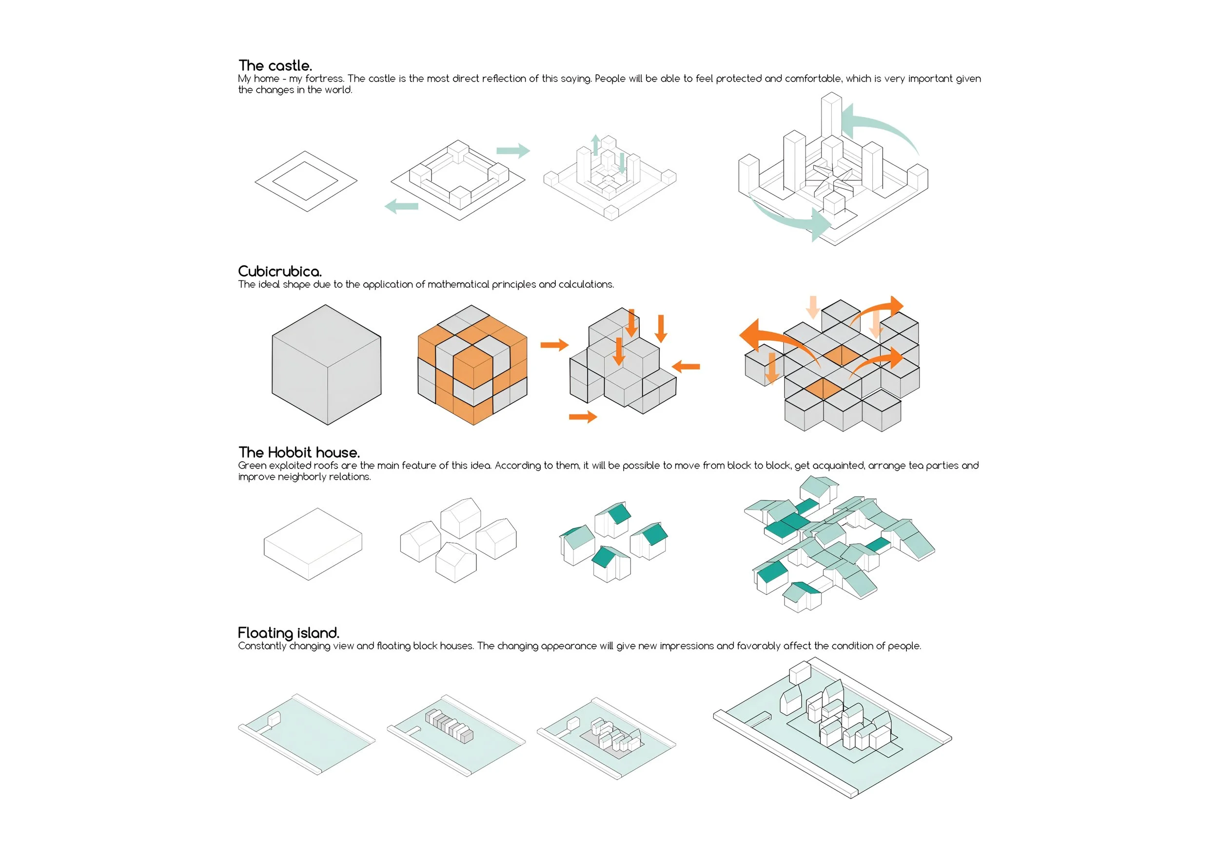What if we take mathematical principles and formulas and use them to create an architectural city? In this project, using the principles of fractal development, blocked construction multiplies. Centers of attraction form micro-districts around themselves and break up the homogeneous development. Additionally, diversity is created through small architectural forms that residents can customize, thus individualizing their own homes.