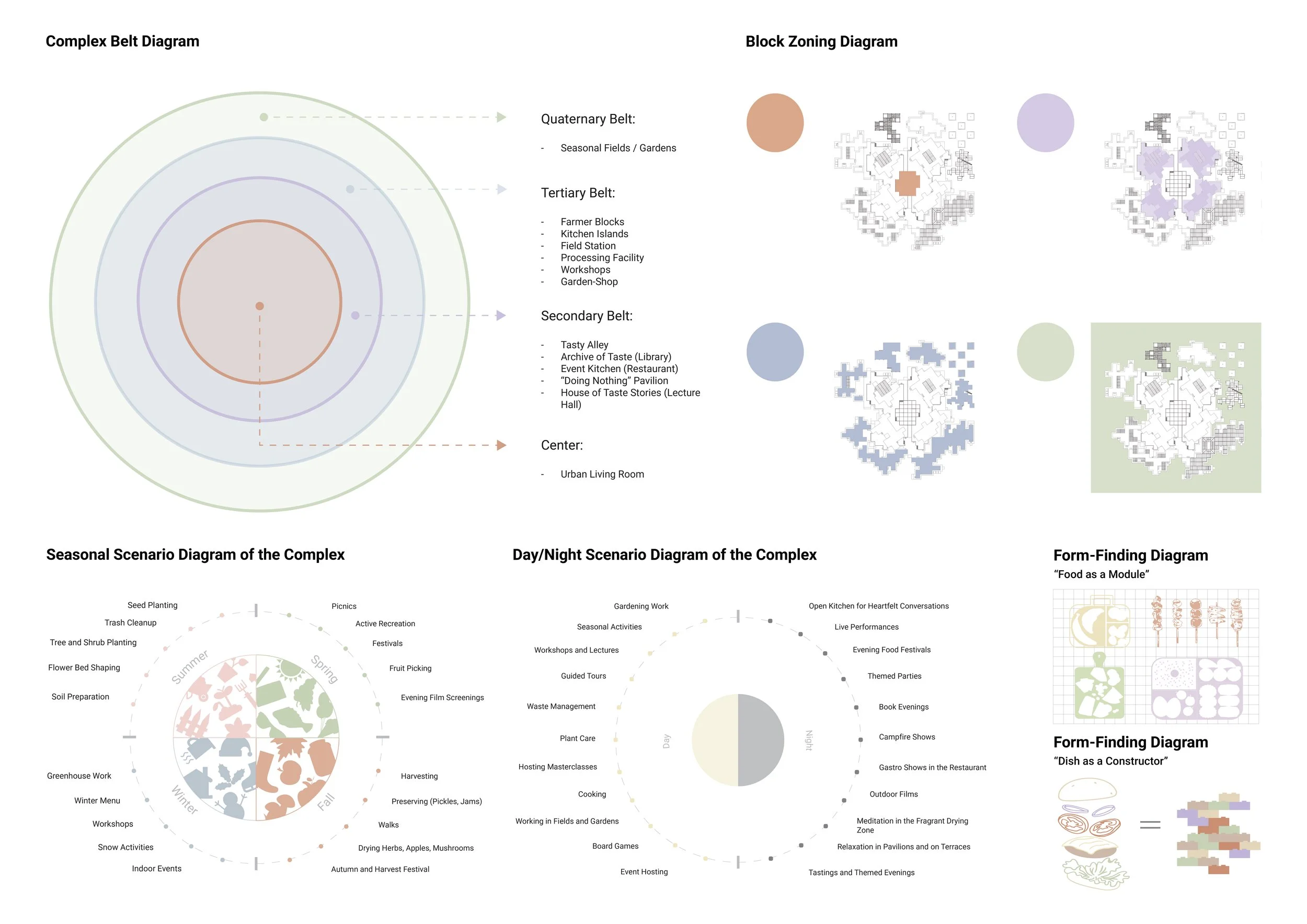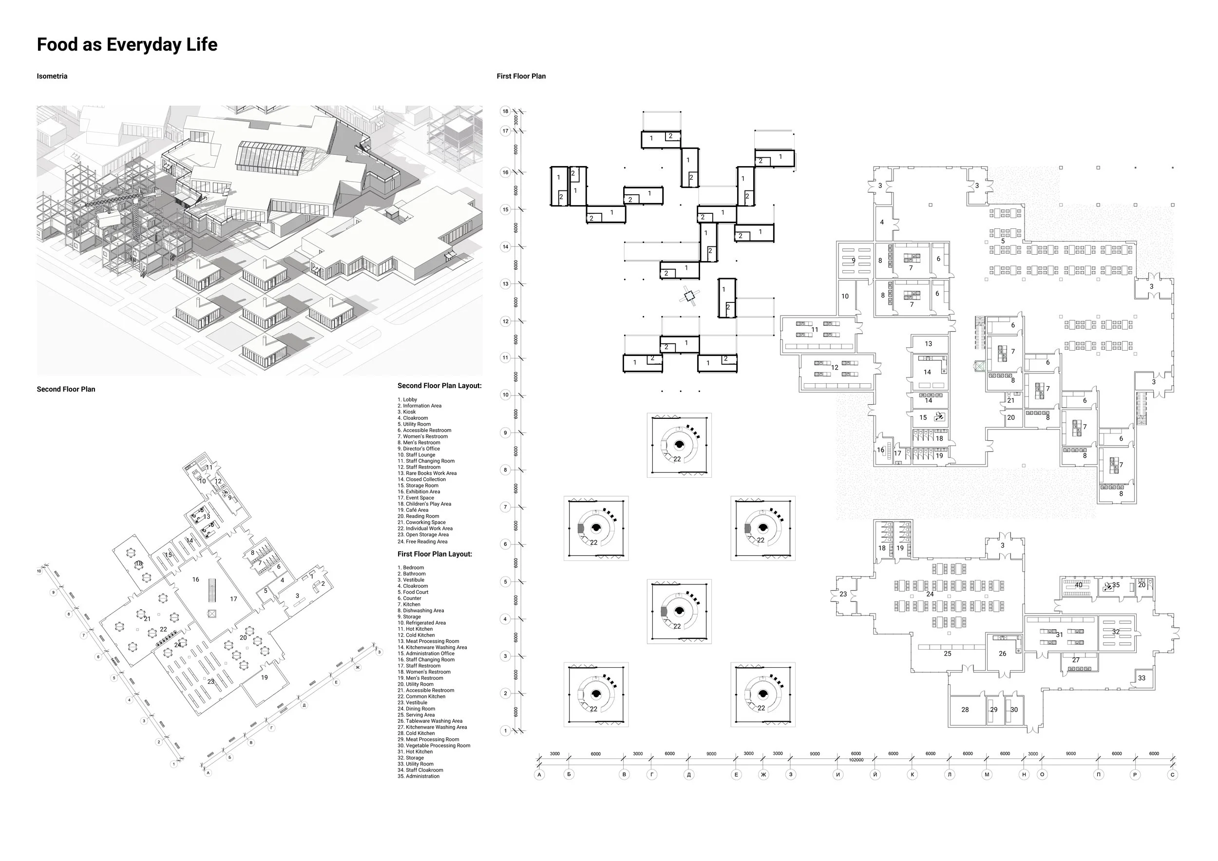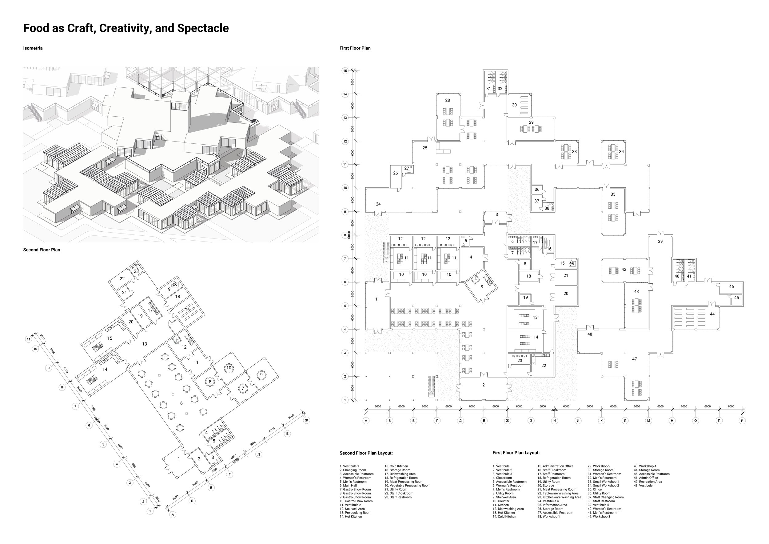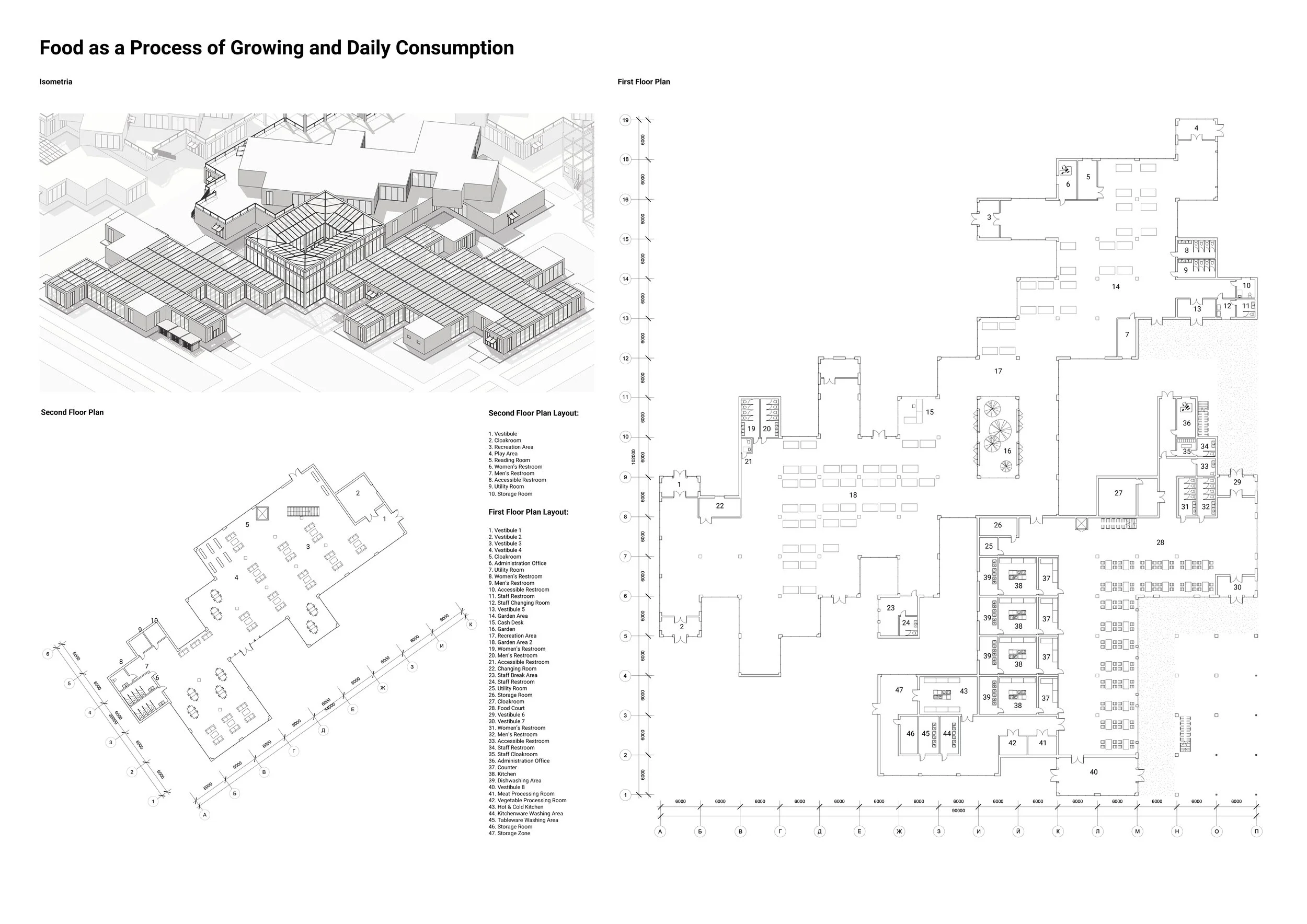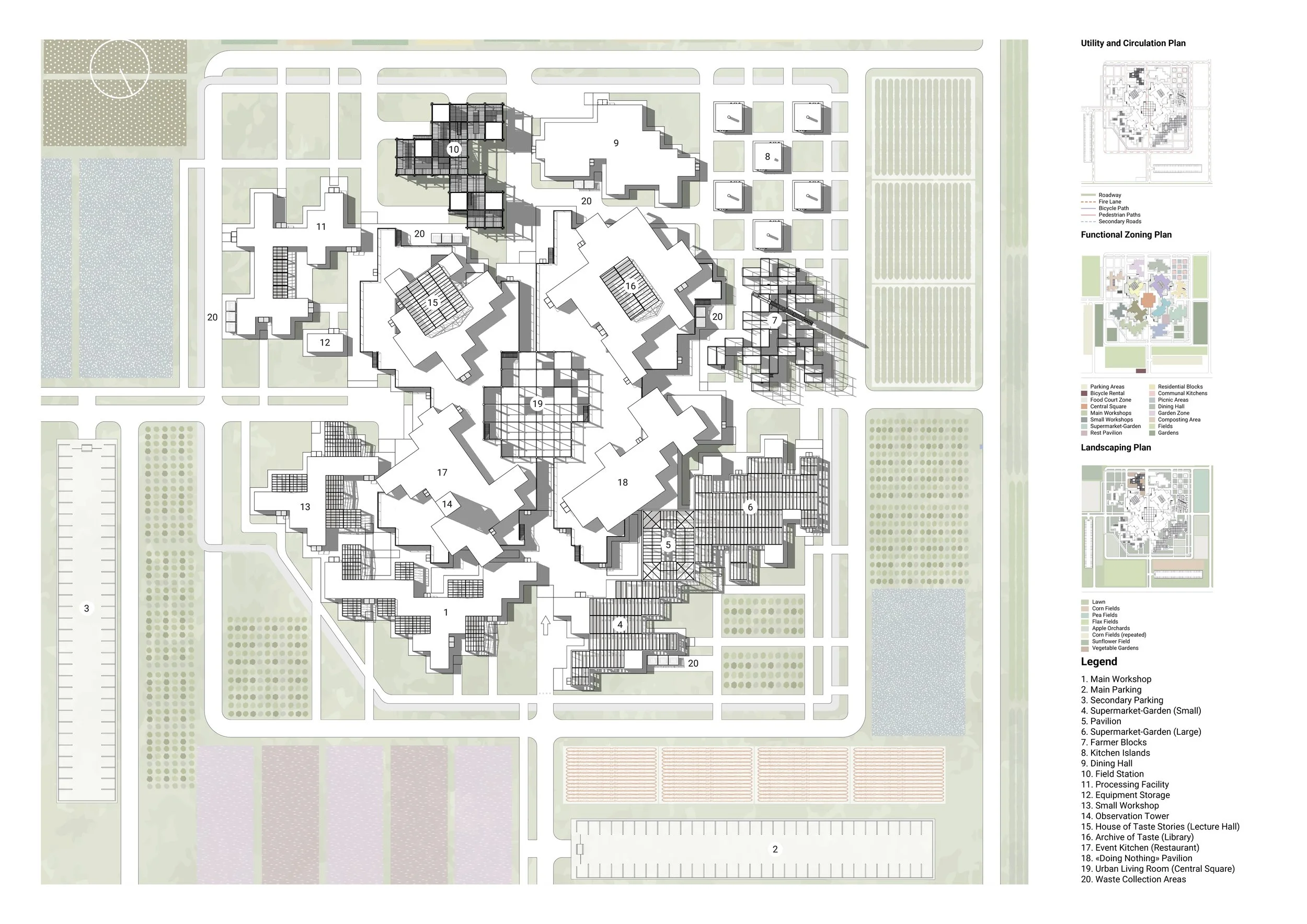 Here, architecture assumes a dual role: it is both an active mediator and a narrative designer. The spatial layout unfolds as a tangible journey through the complete food cycle — from «field» to «table», and ultimately to waste recovery. Visitors are invited to become active participants in a living ecosystem: they can tend garden beds within a «supermarket‑garden», master preservation techniques in a drying facility, prepare meals in a shared kitchen, engage in gastronomic performances, and culminate their experience by sharing a meal at a communal table in the central, adaptable plaza. Each architectural component functions as an integral node in this cyclical system.
