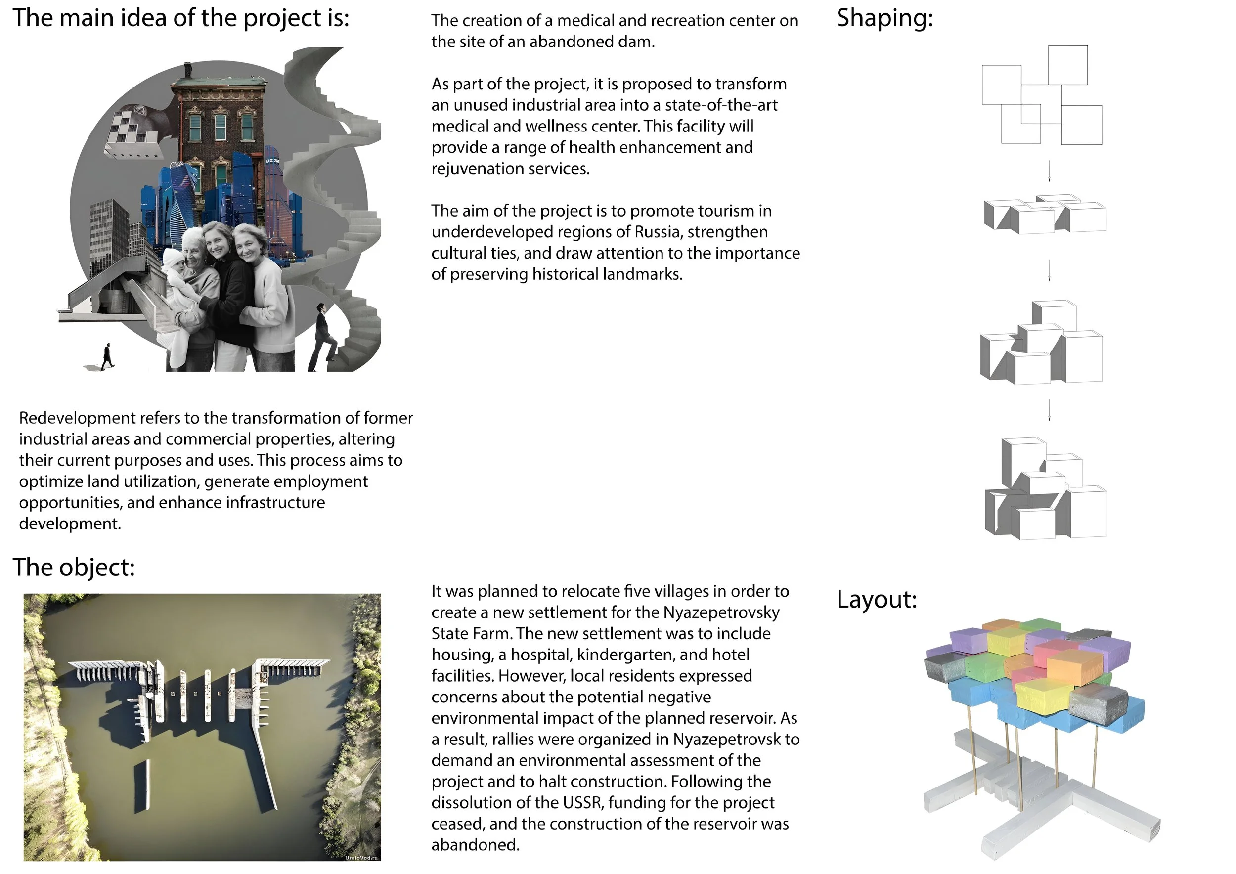 The creation of a medical and recreation center on the site of an abandoned dam. As part of the project, it is proposed to transform an unused industrial area into a state-of-the-art medical and wellness center. This facility will provide a range of health enhancement and rejuvenation services. The aim of the project is to promote tourism in underdeveloped regions of Russia, strengthen cultural ties, and draw attention to the importance of preserving historical landmarks.