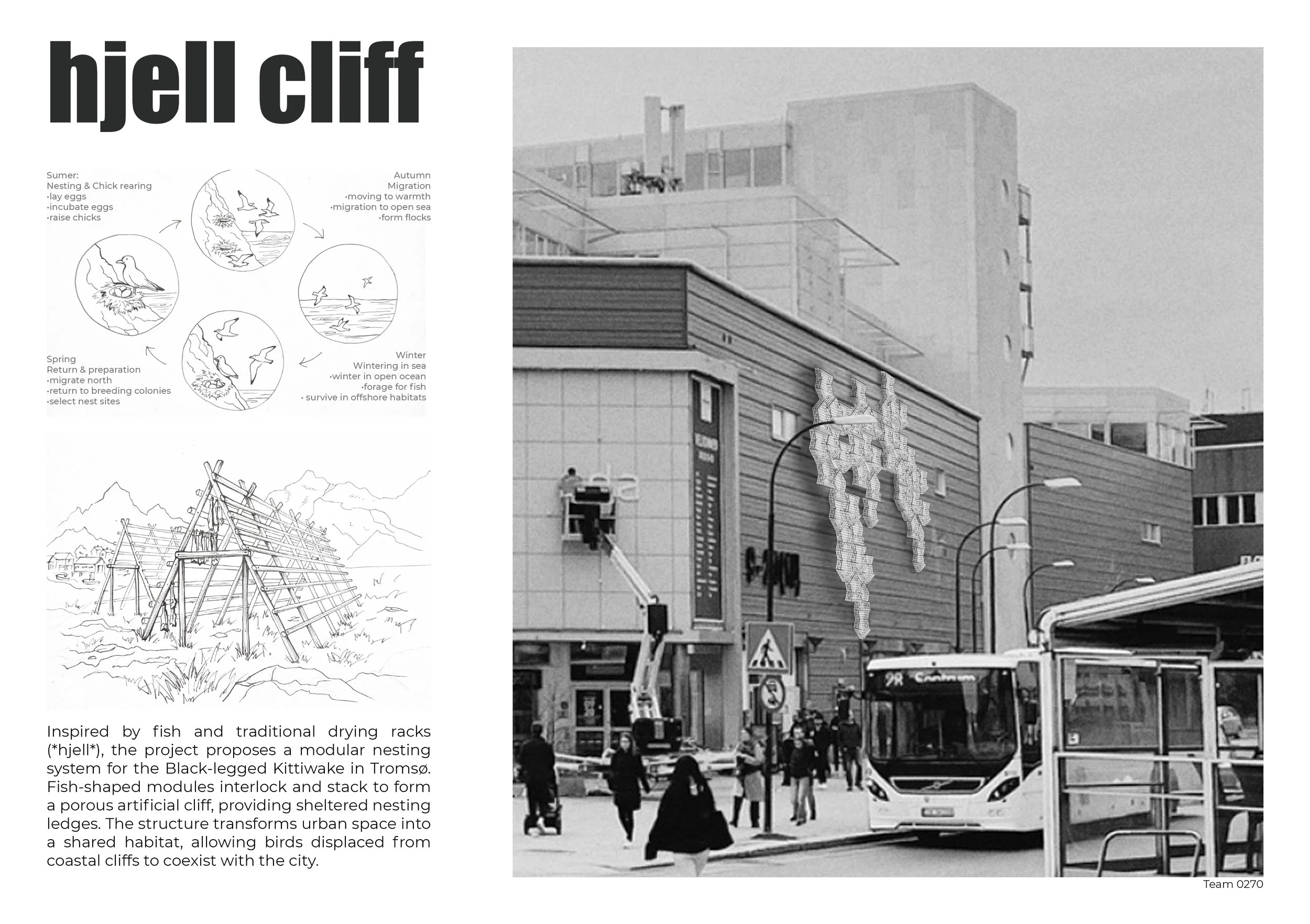 Inspired by fish and traditional drying racks (*hjell*), the project proposes a modular nesting system for the Black-legged Kittiwake in Tromsø.