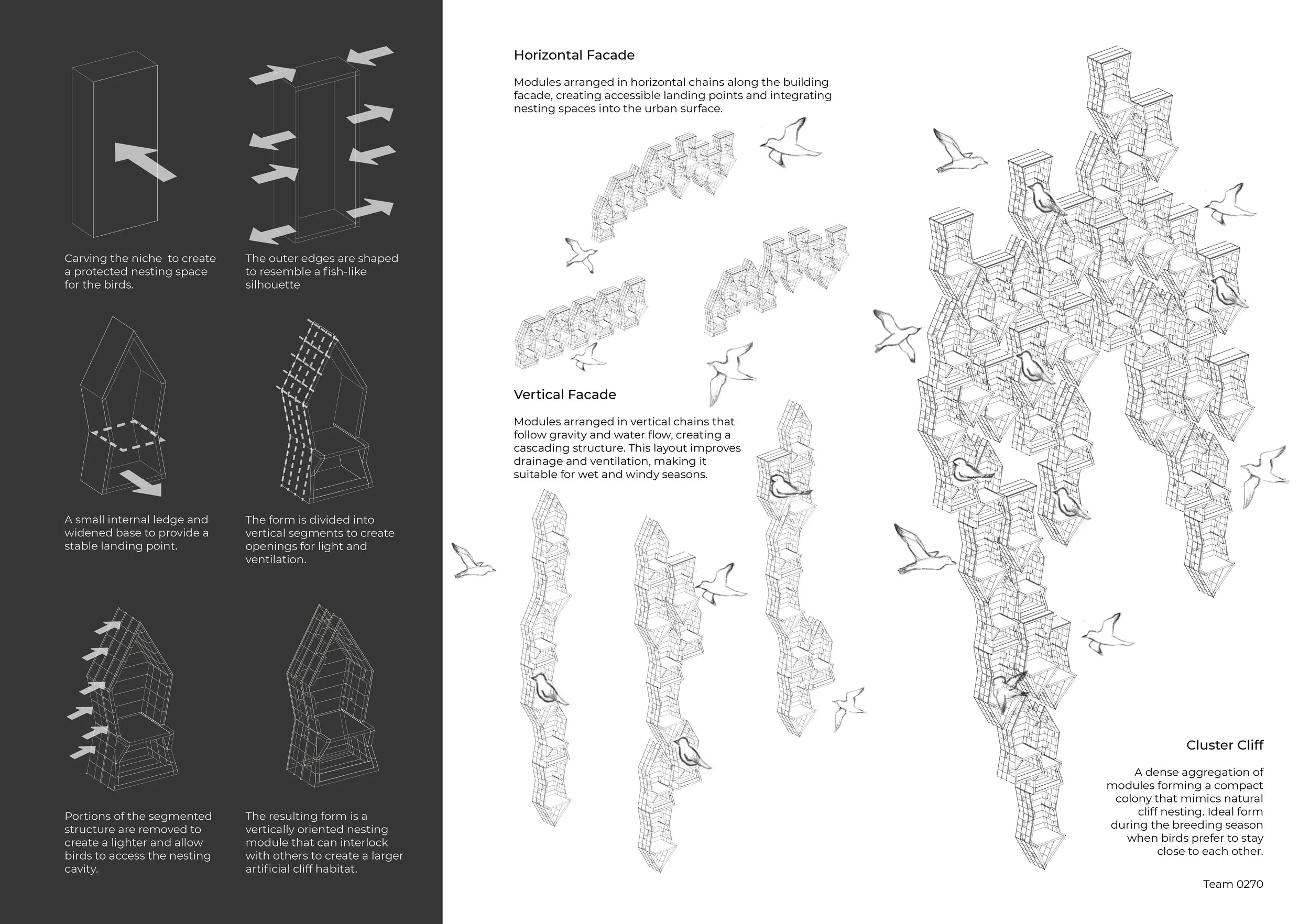 Fish-shaped modules interlock and stack to form a porous artificial cliff, providing sheltered nesting ledges. The structure transforms urban space into a shared habitat, allowing birds displaced from coastal cliffs to coexist with the city.