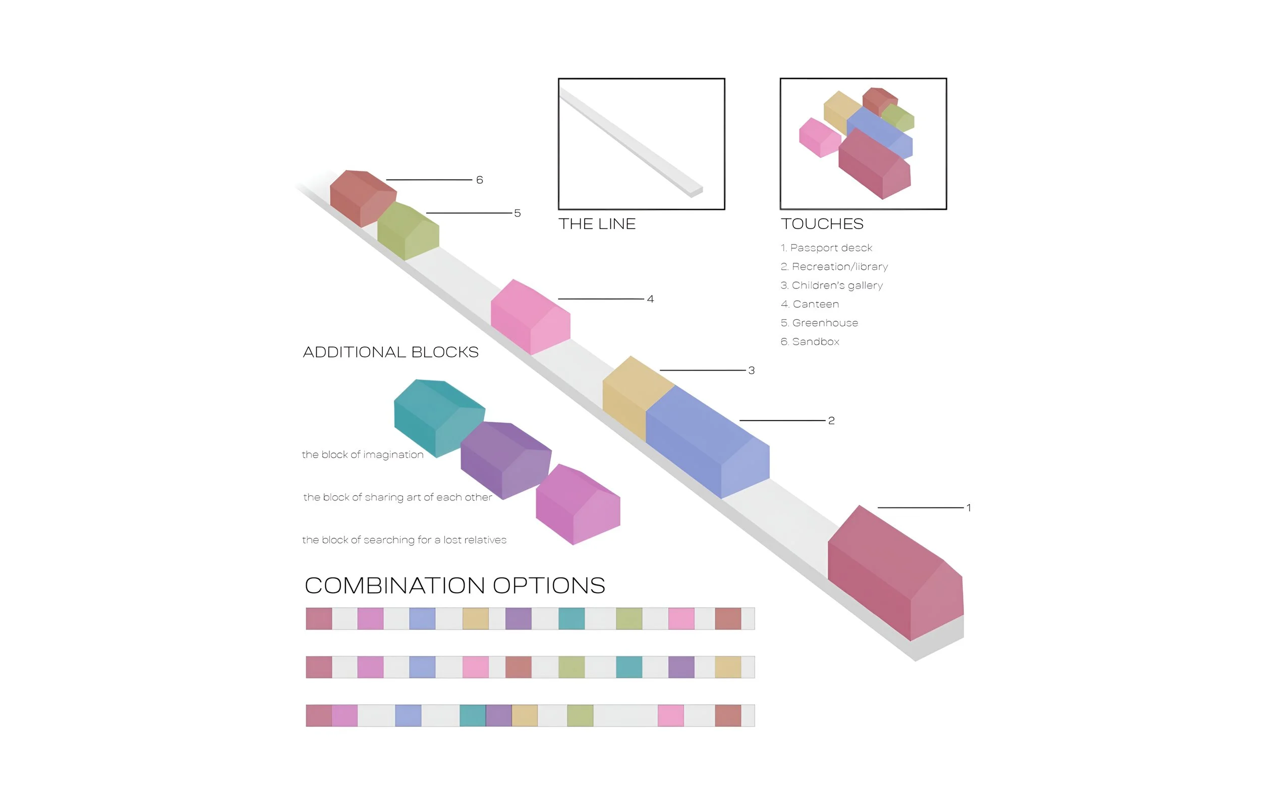 The project is located on the border of North and South Korea. We often do not understand those who are not like us. One line and many touch points will help to connect different people and encourage them to overcome life difficulties and achieve their goals through communication with others. The line of touches is conceived according to the principle of the designer. You can add, remove or rearrange several blocks (touches), adjusting the degree of socialisation. You can connect them all along the line, which will create a long corridor: greenhouse, sandbox, library and even a passport office.