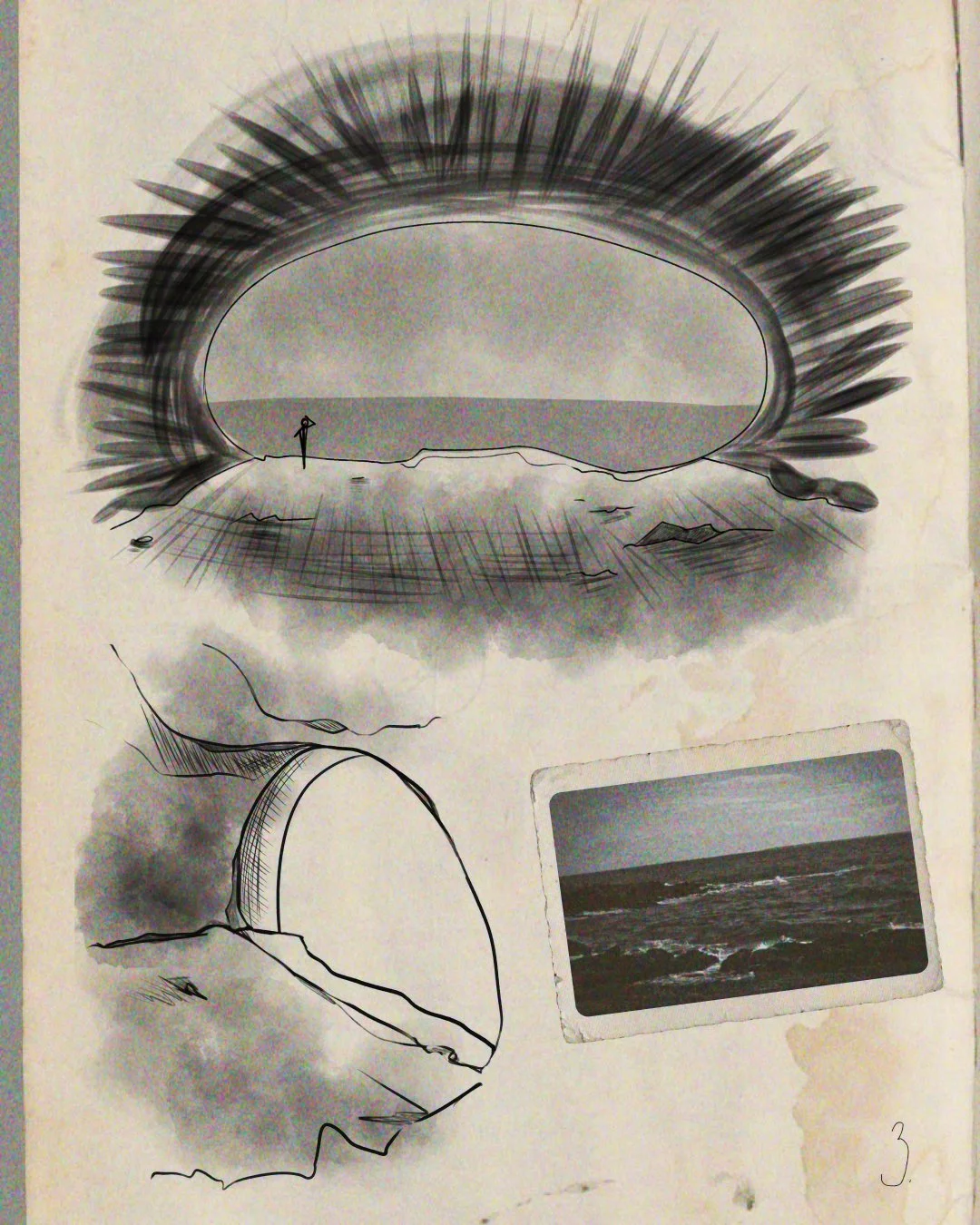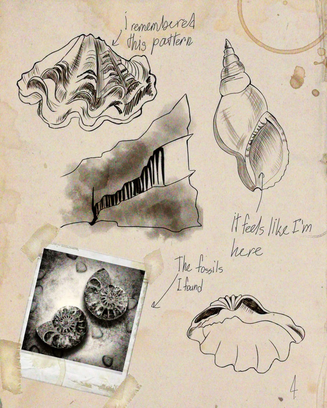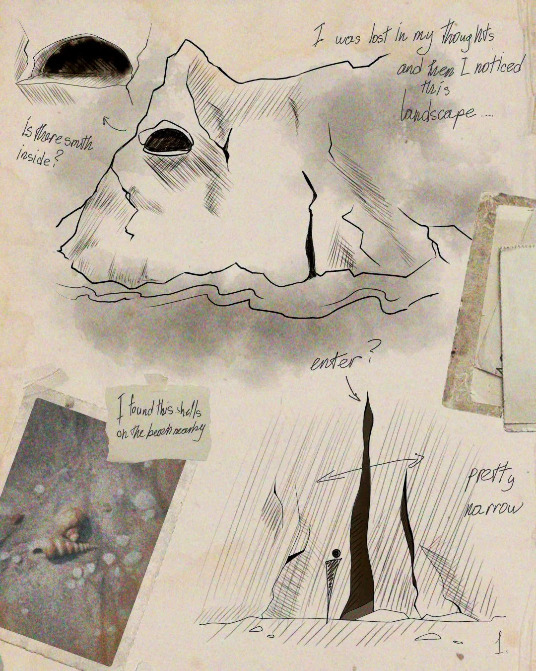 «I don't remember how long was I standing on the top: it could be a few minutes, maybe hours.... When I decided to go back I noticed that the familiar sound that I heard before was actually the sound of the ocean. On my way back I studied the space around me. Its strange layered structure reminded me of an ancient fossil that I found on one of my expeditions not so long ago. The structure reminded me of a shell. And the most beautiful thing about this was that this place was untouched by men. The form and curved paths was created by nature. My theory is that this area was formed by fossilized creature from the past. If that's the case I made a grand discovery!»
