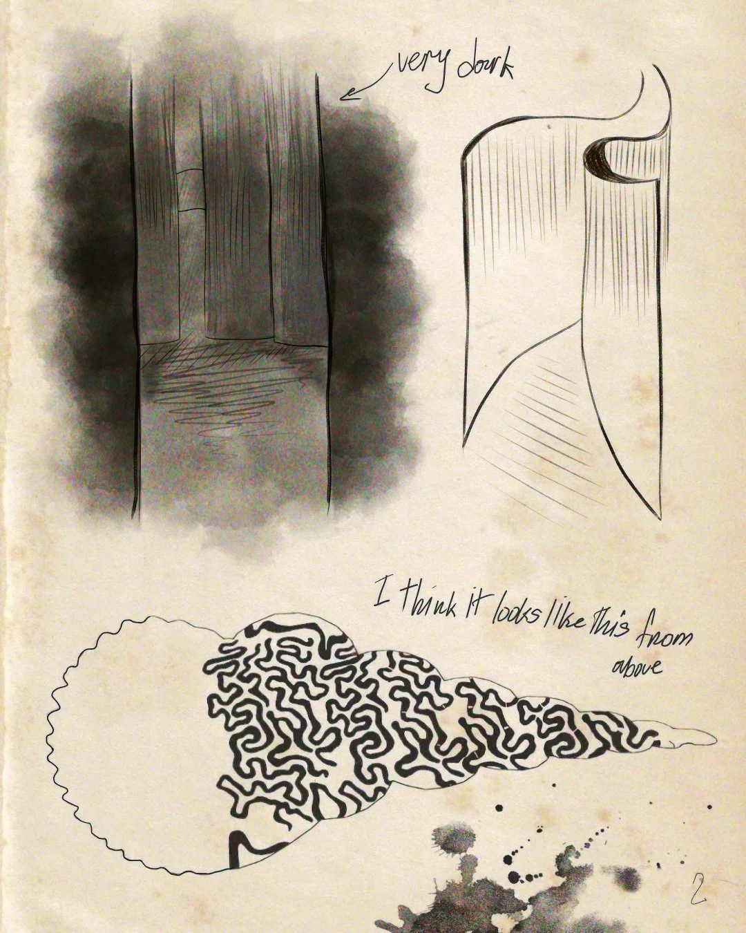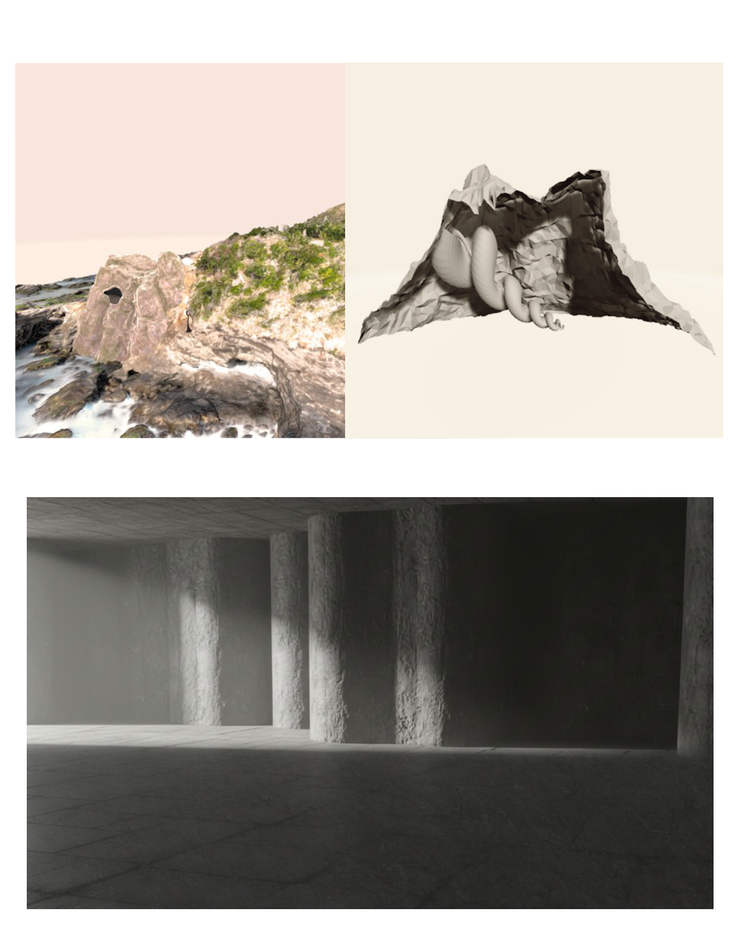 «Once i entered I felt constrained. The place around me was so narrow that i couldn't even spread my arms even if i wanted to. Out of curiosity, I continued on the way through the strange labyrinth. Walls were still squeezing me. Light that came through the entrance was nonexistend by now so i could barely make sense of the passages. Do they lead somewhere or nowhere? It was quite easy to navigate intuitively in this space but the walk was more challenging than on the shore. This made me realise that while walking through this space I might be ascending the mountain. Then, I heard a sound from really far away. It felt familiar, like I heard it before when I was a child but I still couldn't make cense of it.»