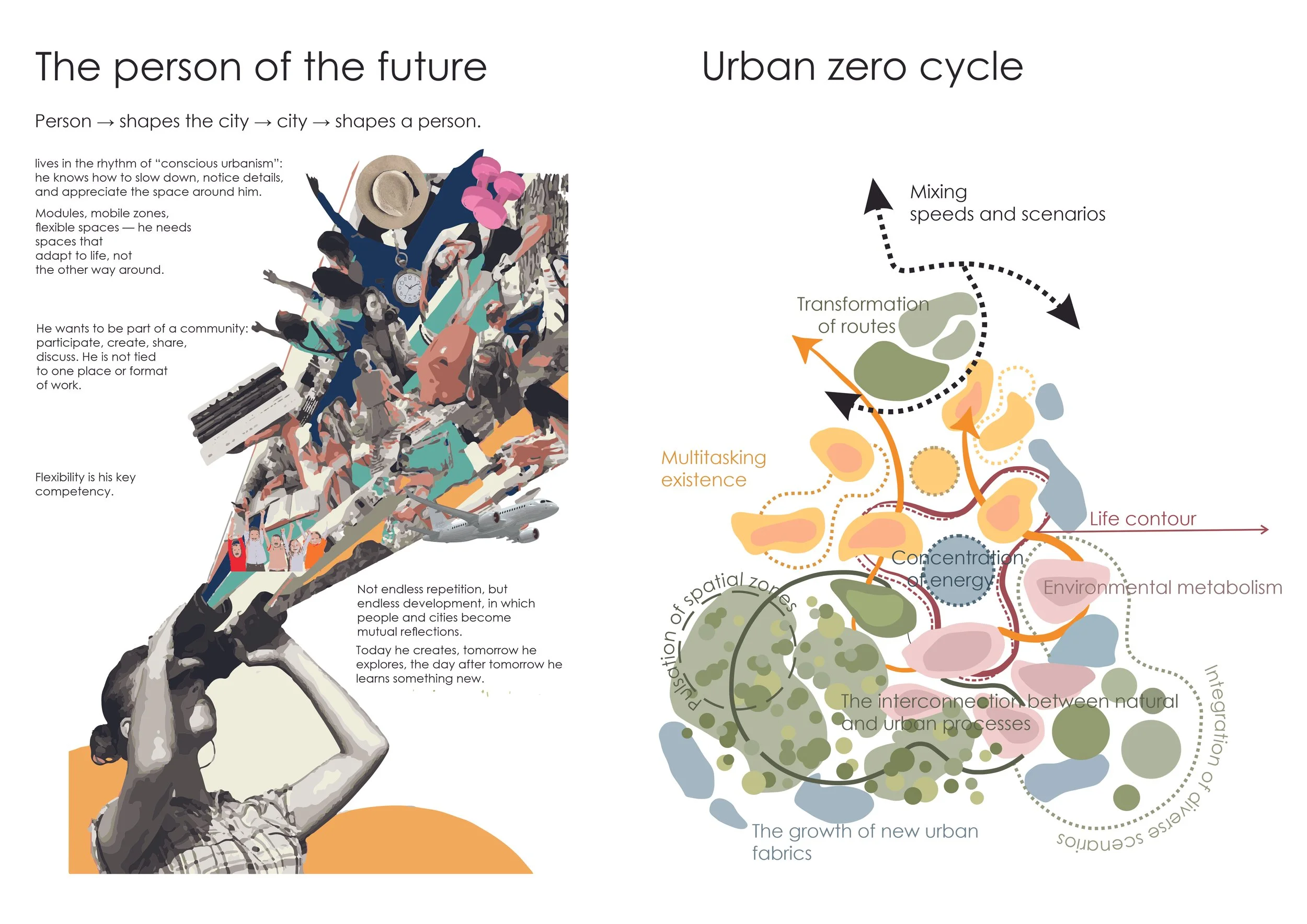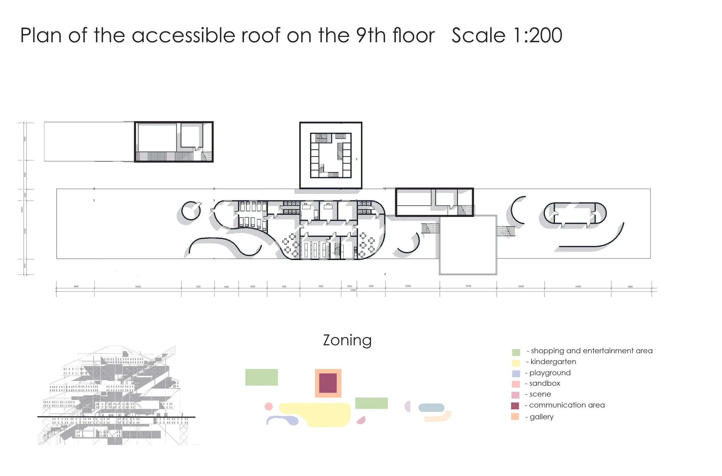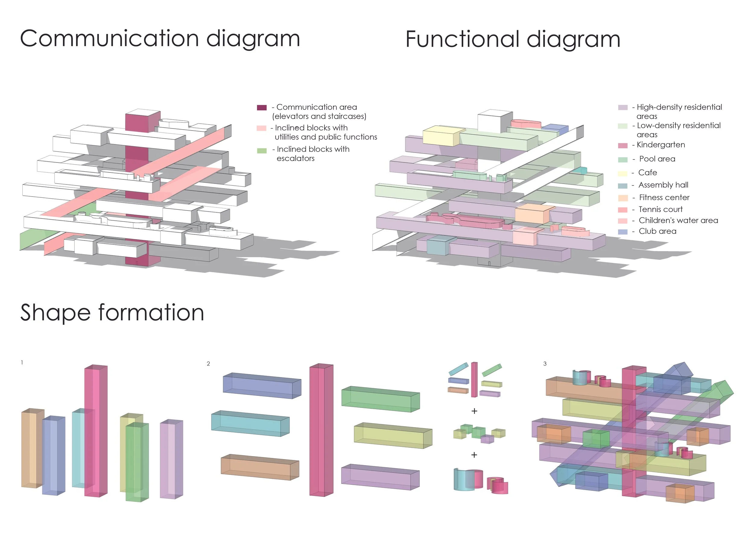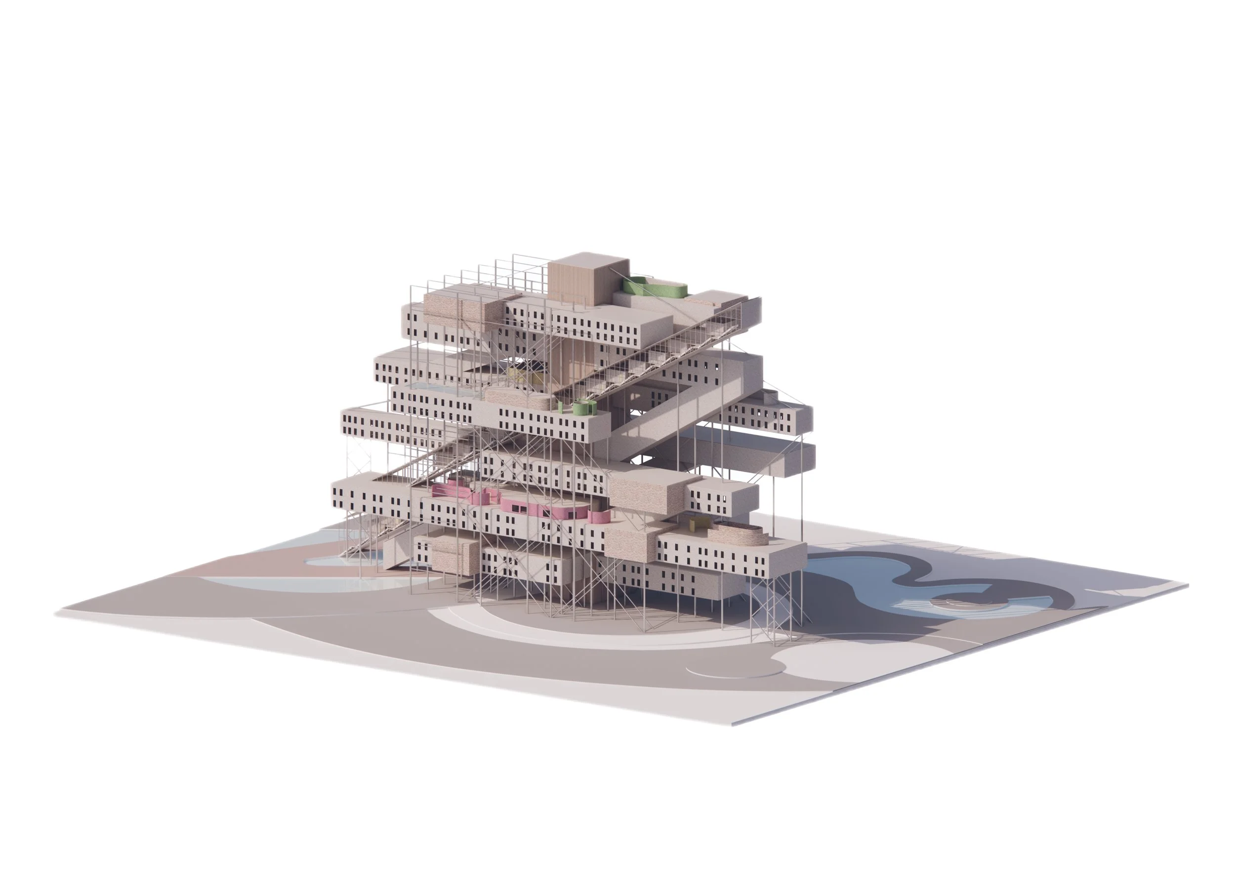 Vertical Public Realm. Rooftop spaces extend the city upward, hosting kindergartens, pools, sports areas, and green terraces. These elevated public zones redefine urban density, introducing a stratified model of community life where shared facilities exist at multiple levels.