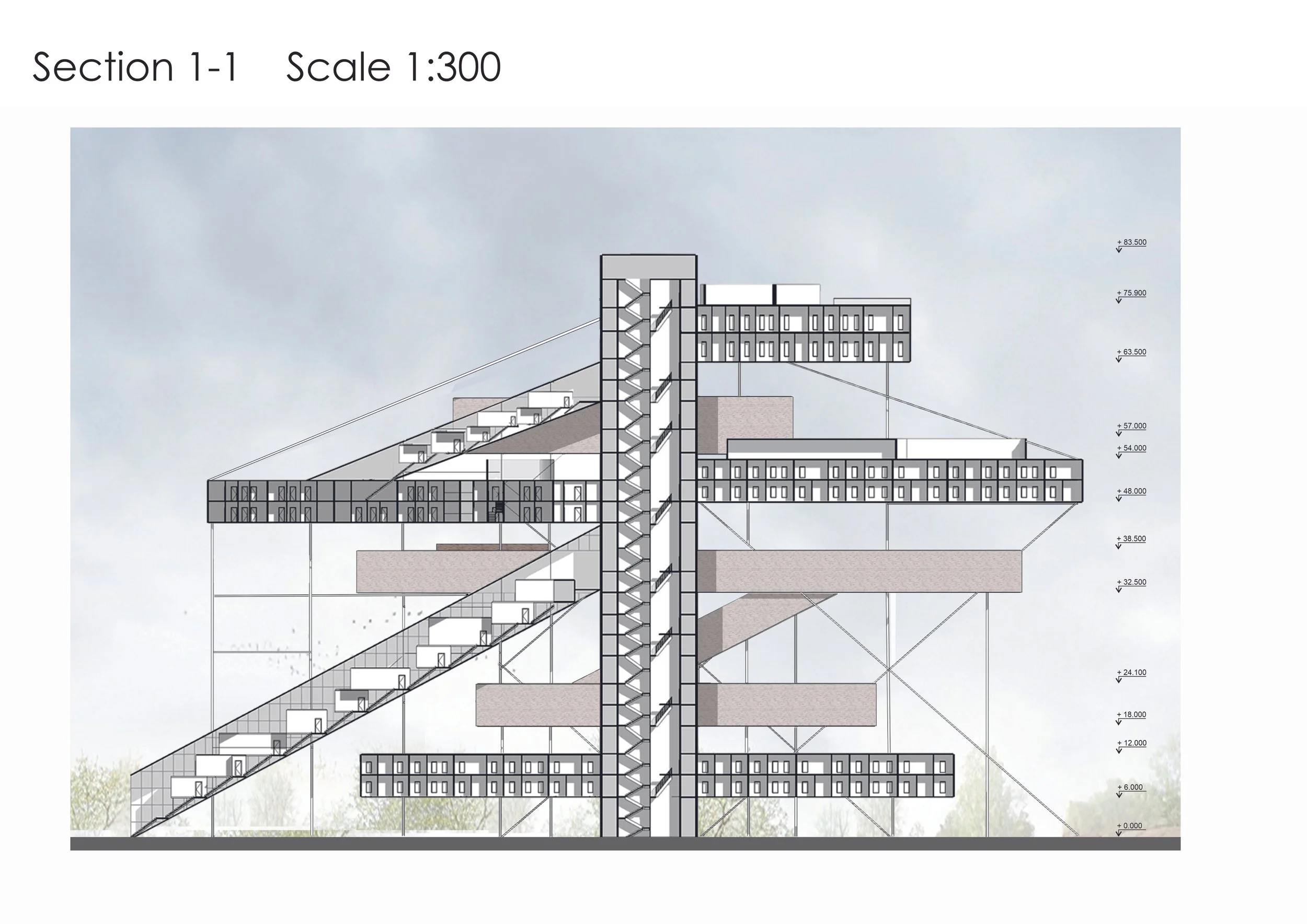 The architectural concept emphasizes experiential verticality — a quality where height translates into layered social and sensory experiences. Pathways, viewpoints, and communal areas are designed to foster spontaneous encounters, turning vertical movement into a form of urban interaction.