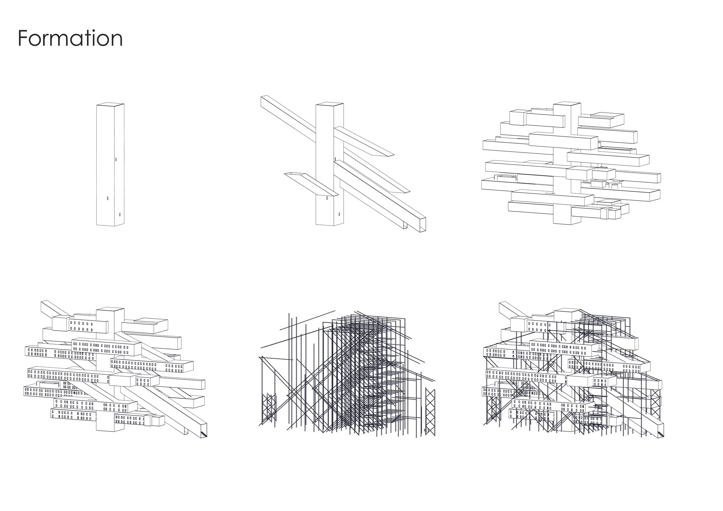 Dynamic Circulation. Sloping volumes and interconnected pathways create a landscape of continuous movement. The central communication core — integrating elevators, staircases, and sky galleries — serves as the building’s structural and social axis, transforming transit into a social experience.
