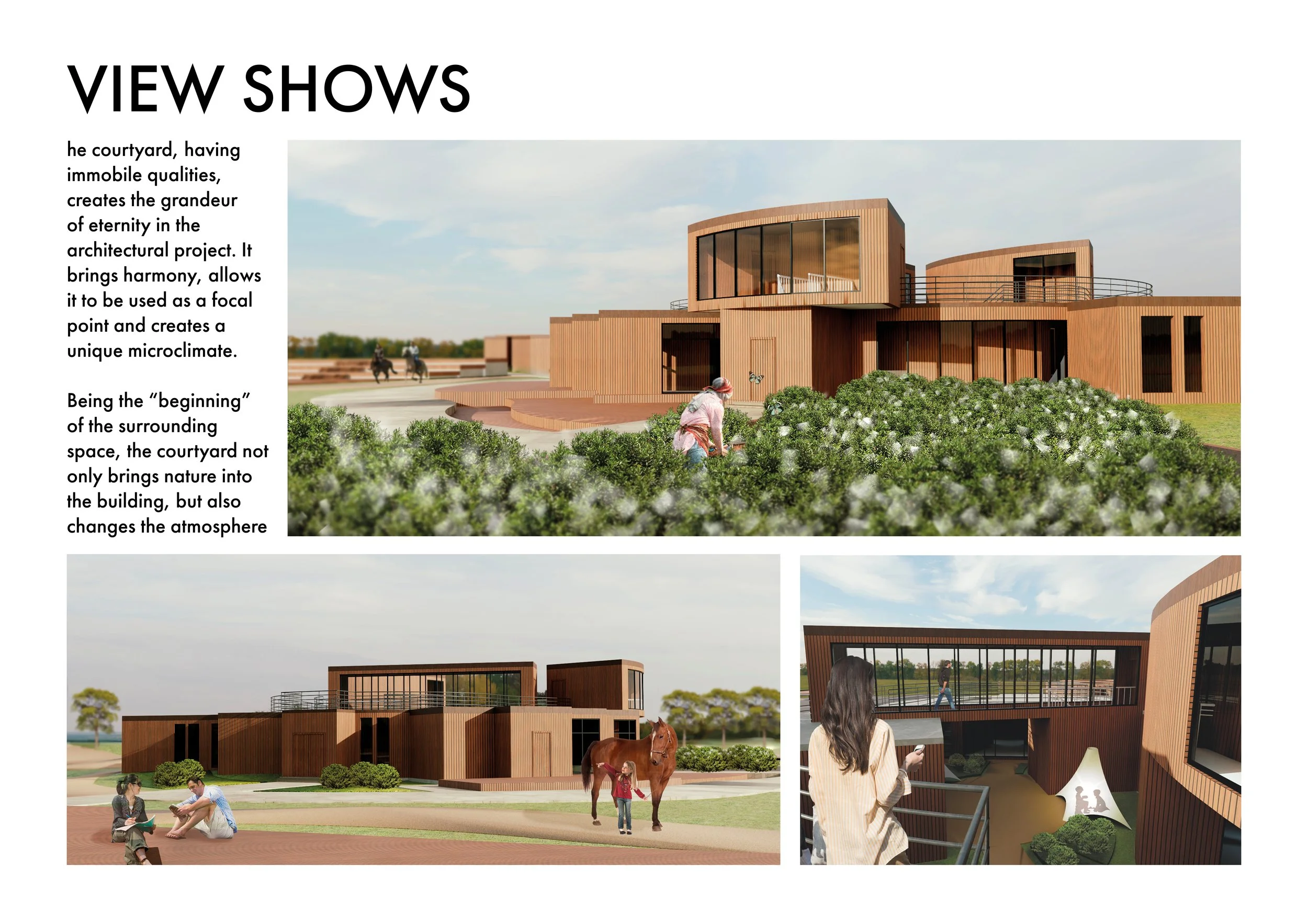 The spatial principle of the house is based on the overlapping spaces. The central courtyard is a zero stable point. It is gradually being filled with additional spaces: living modules, workshops, guest houses and craft units. Thus, the structure of the house consists of a stable core (courtyard) and dynamic shells (functional modules). The courtyard forms an autonomous space consisting of an active garden and an exploitable roof connecting the living rooms of the residents. Moreover, the house is surrounded by a horse trail in the external space.